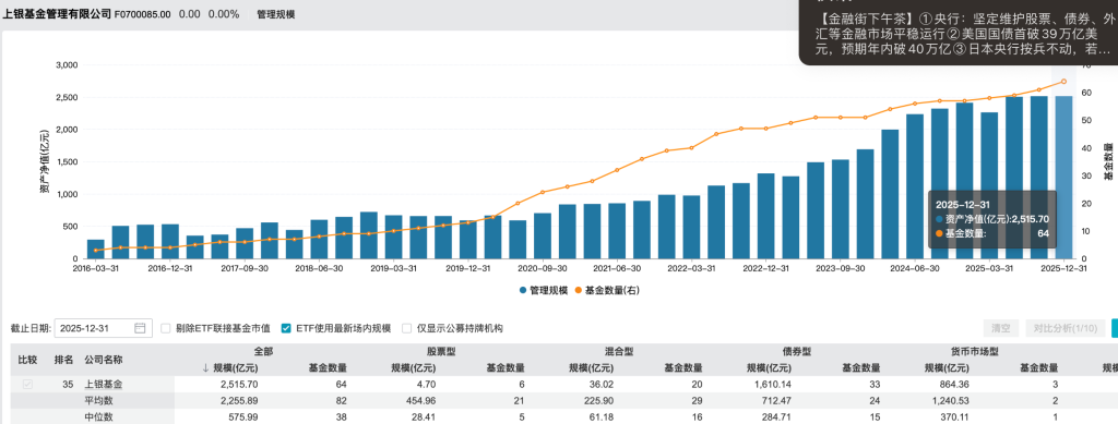 另据官网尊府,上银基金汲引于2013年8月,注册老本东谈主民币3亿元。这次外资的引入恰好上银基金限度站上新高的环节节点。从处分限度来看,铁心2025年12月末,公司处分限度达2515.70亿元,创下汲引以来的限度峰值,行业名次为第35名。