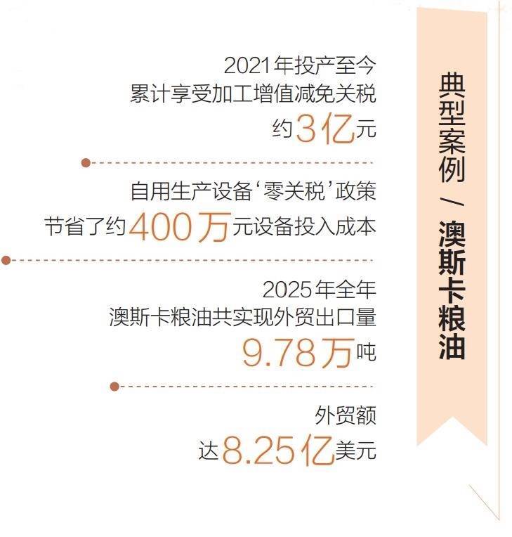 r同样享受政策红利的还有澳斯卡粮油。作为一家集食用植物油、植物卵白和磷脂家具研发、坐褥、加工和国表里产、贸、销为一体的空洞型粮油加工企业,澳斯卡粮油主要从巴西、加拿大等地入口原料,在洋浦加工成粮油家具后,销往海南市集和其他省份。2021年7月23日,澳斯卡粮油收效完成寰球首单加工升值30%免关税业务。